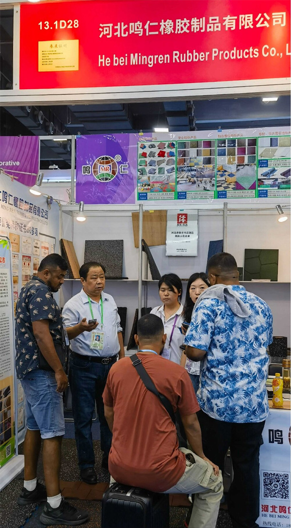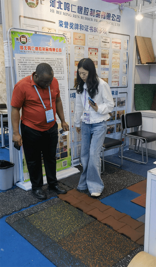 Hello, indoor rubber floor, I want 2000square meters。4月25日上午,一位來自法國的客商擠在廣交會B區(qū)13.1D28展位洽談桌前簽約下了7.8萬美元的意向訂單?!傍Q仁”牌橡膠地板產(chǎn)品在廣州為期五天的第137屆二期廣交會上,成為國外商家的搶手貨,日接納國外商戶350多人次,已有意向訂單額114萬美元,刷歷史新高。